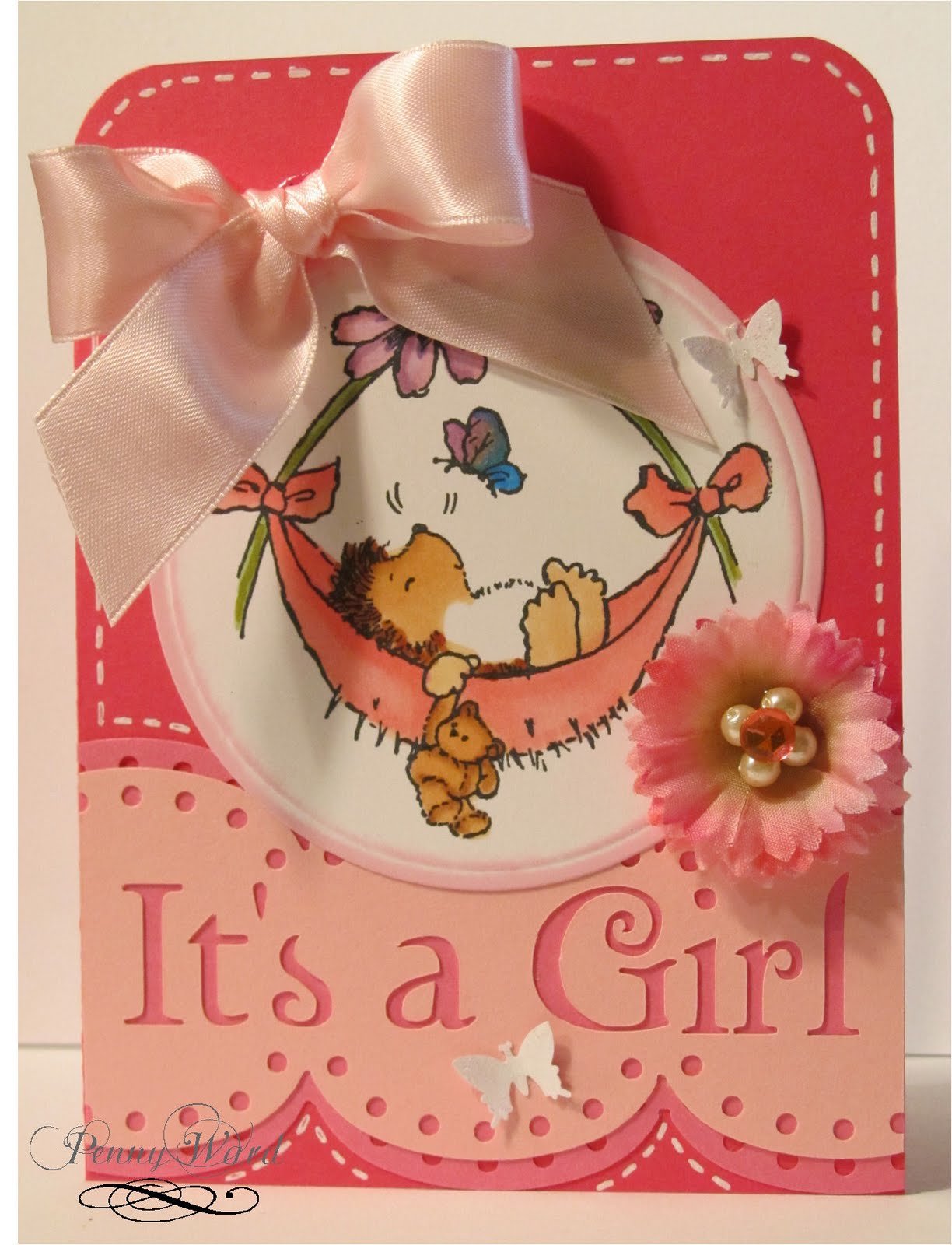 Used Penny Black Baby Hammock stamp. Cut lettering with Silhouette, edge punched greeting as well as butterflies, topped with clear stickles.