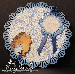 Stamped Penny Black Paisley Outline onto white cardstock and embossed with white powder. Inked this with Tim Holtz Faded Jeans. The outside of the circle is a strip of paper inked with TH Faded Jeans, then border punched with Martha Stewart deco fan punch. Cut this strip very close to the edge of the punches and clip between each "fan". Attached to the back of the circle.