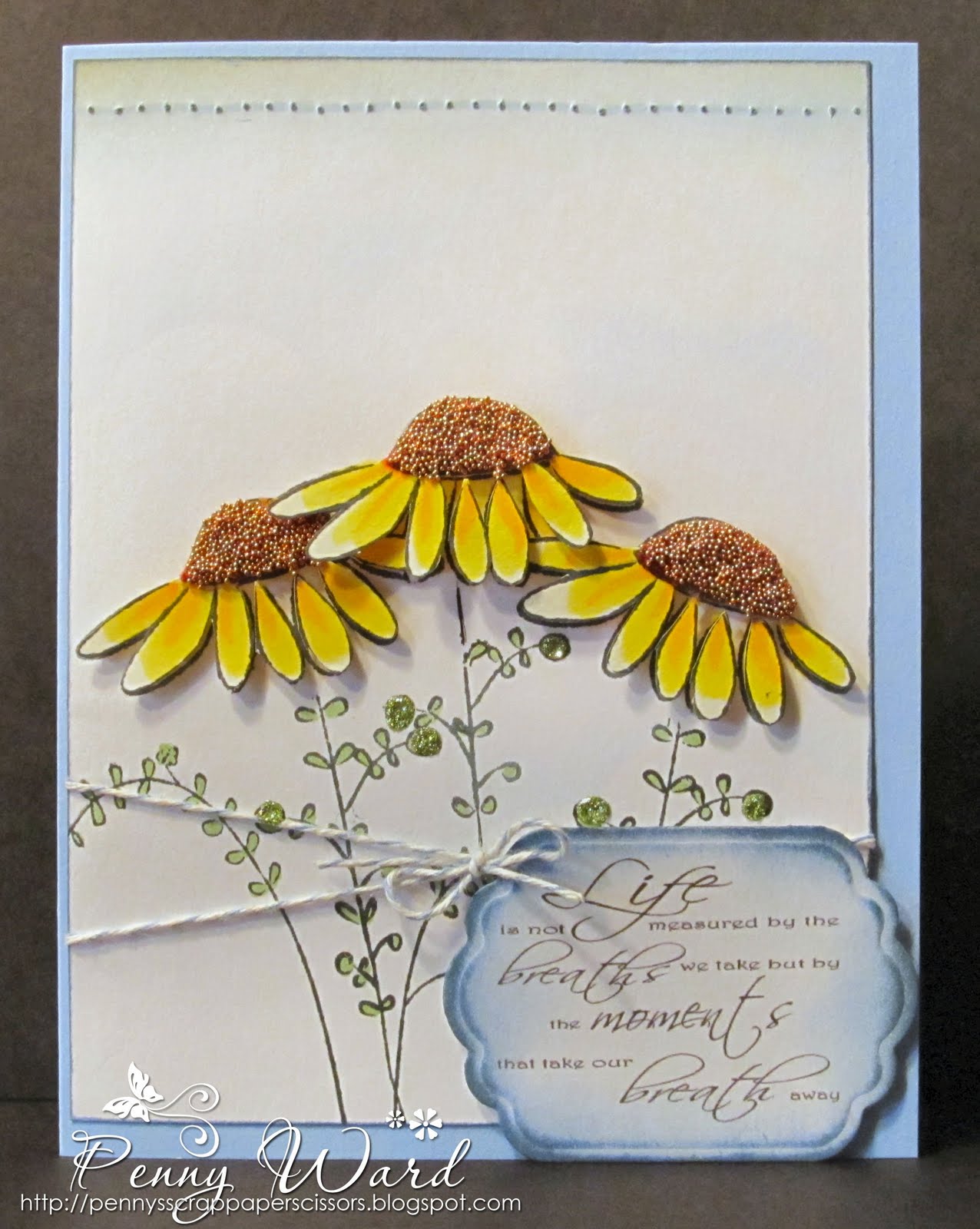 From the Penny Black Touch of Whimsy stamp set, I stamped and masked the flower 3 times. Colored them with Copics and added glass beads to the center of the flowers. Stickles were added to the leaves. Sentiment is a digi, die cut with Spellbinders and inked the edge with Tim Holtz Faded Jeans. Used hole punch at the top, then lightly swiped ink pad over the raised impression. Attached twine.