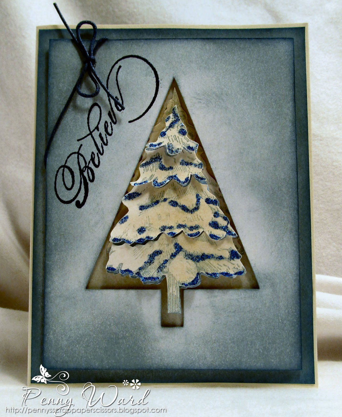 Next layer is cut just a bit smaller than the previous layer, then cut a tree shape in the center. Again ink the edges with Weathered Wood ink, stamp sentiment with Watermark ink, add Lapis embossing powder and heat set, then add bow.