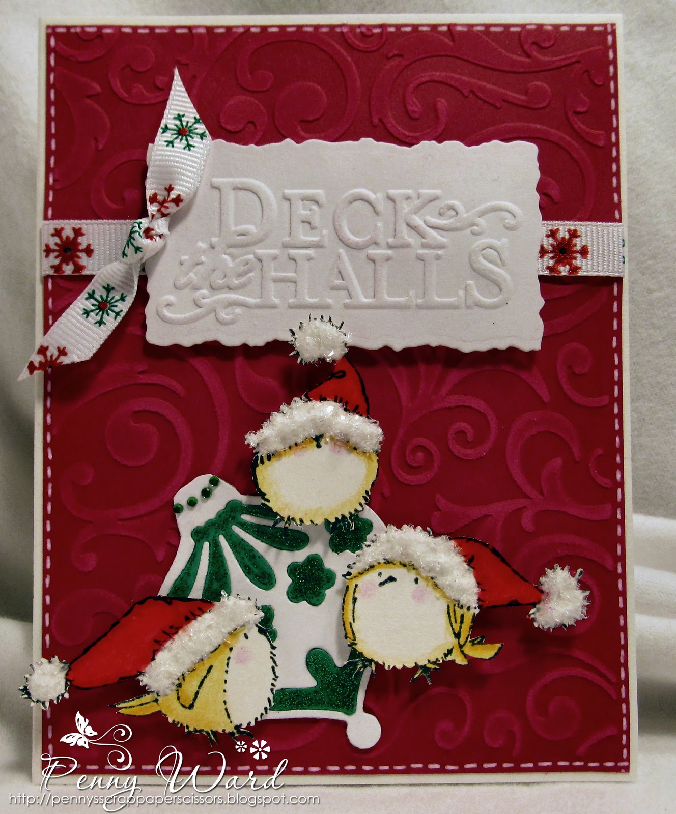 Cute little chicks from Penny Black Winter Wonderland were stamped, colored and fussy cut. Their hats have glossy accents and the "fur" is done with Aleene's True Snow with Twinklets Diamond Dust on top.