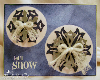I used spellbinders die cuts for the snowflakes, cutting two each of Navy Blue & Silver card stock. Using foam adhesive I attached these to the two white circles. The bows are made of cheesecloth, sentiment was heat embossed.