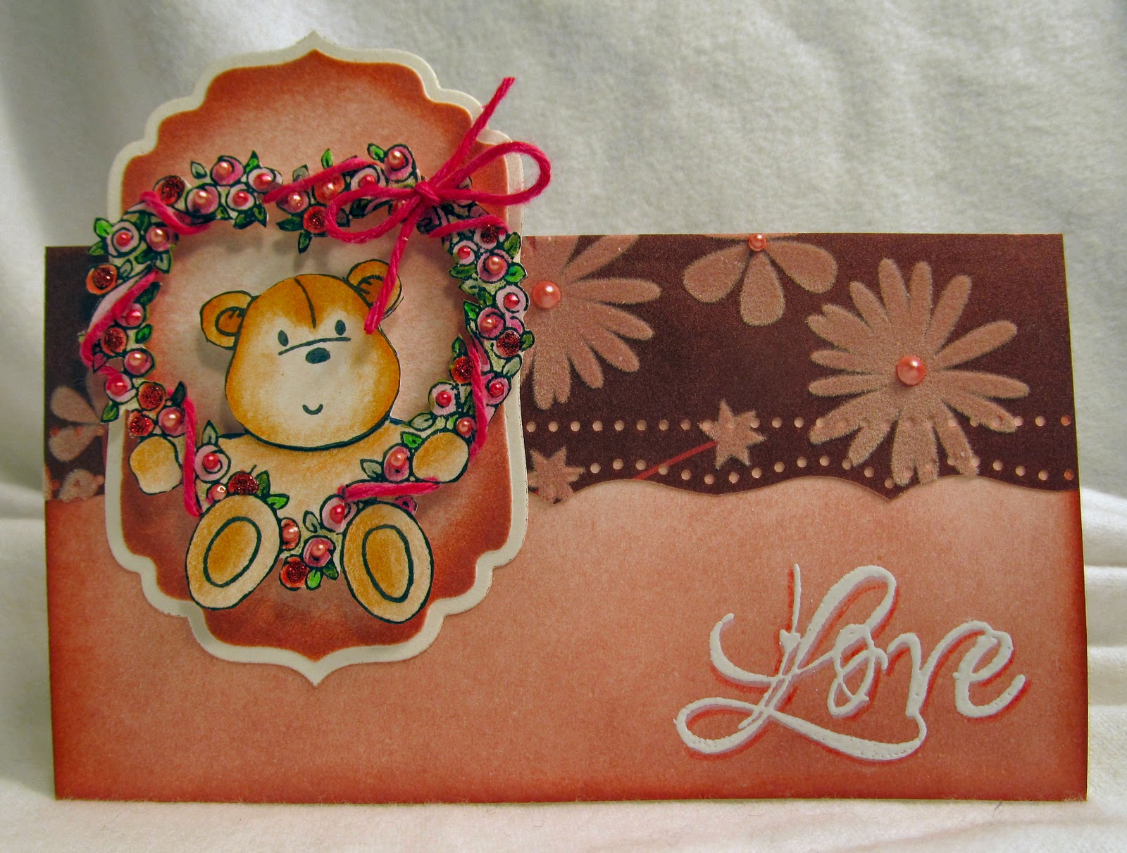 4) Stamp bear two times, color one. Stamp pattern over heart, fussy cut all. Attach heart to bear, attach bear to center of frame