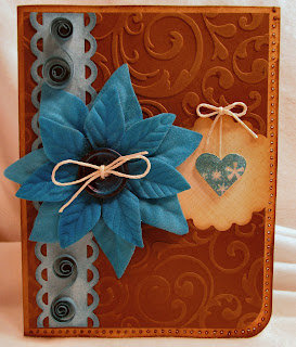 2) Cut a piece of burgundy card stock just a bit smaller, run through cuttlebug, distress edges with tool, attach to card base