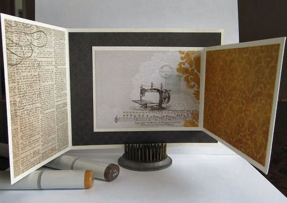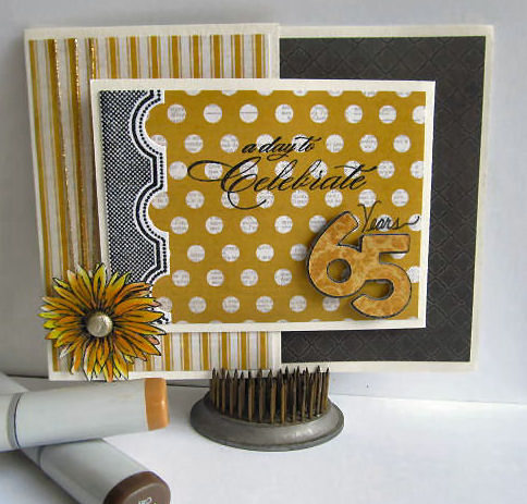 I made this card for my parents 65th Anniversary. All panels of the Joy Fold card are covered in patterned paper. The flower and sentiment were stamped, heat embossed and colored. The “65th” is cut from my Cricut.
