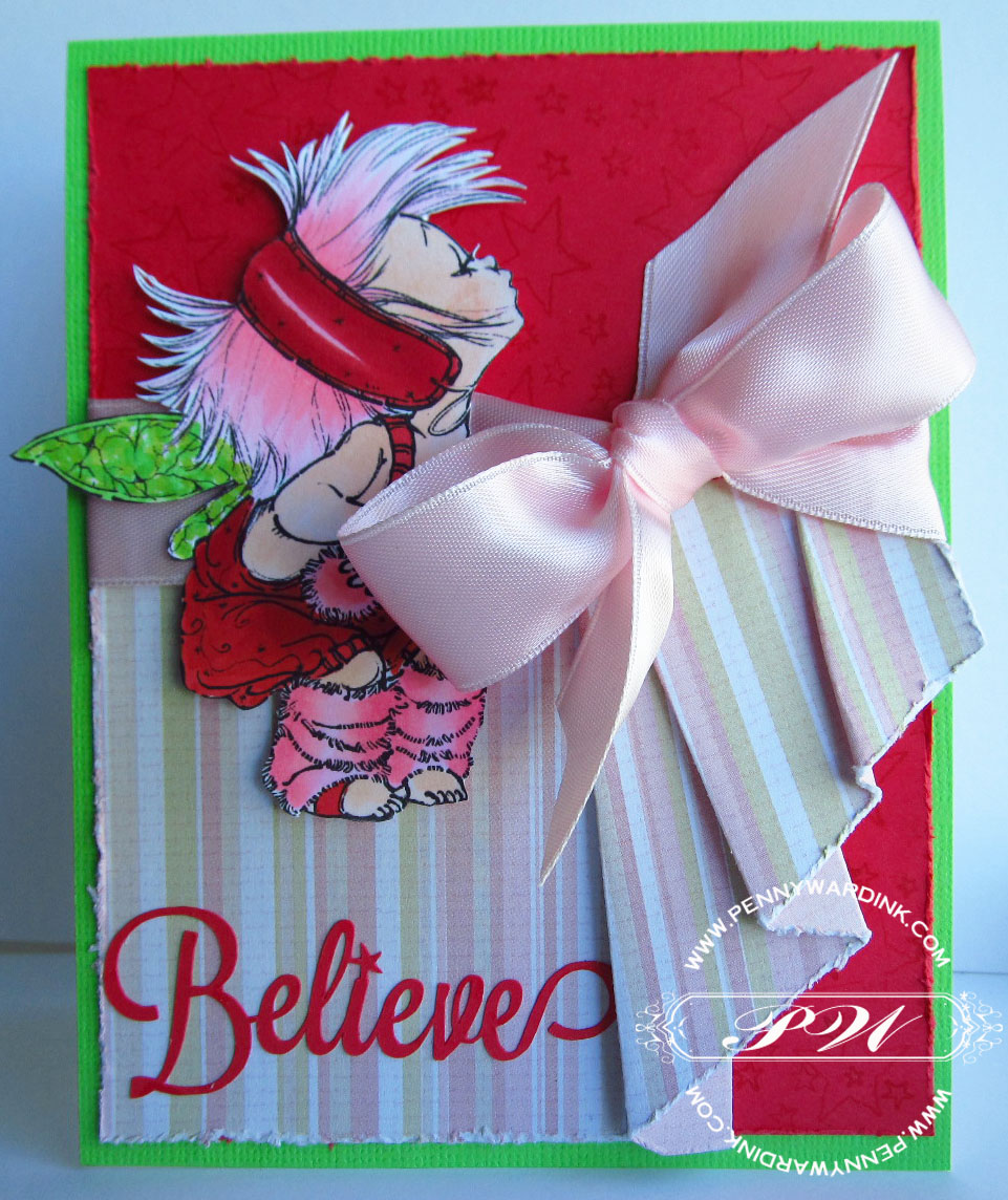 Tomato Red card stock was stamped with a very old stamp using Love Letter ink. "Draped" portion of card is patterned paper. Of course the image is the Fairy Stardust stamp from Penny Black Inc. After tying bow, the whole thing was then attached to textured green card stock with Xyron Mega Runner. Sentiment was cut with Silhouette and zipped through my Create A Sticker.