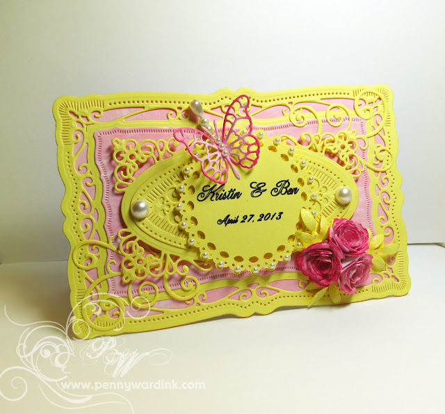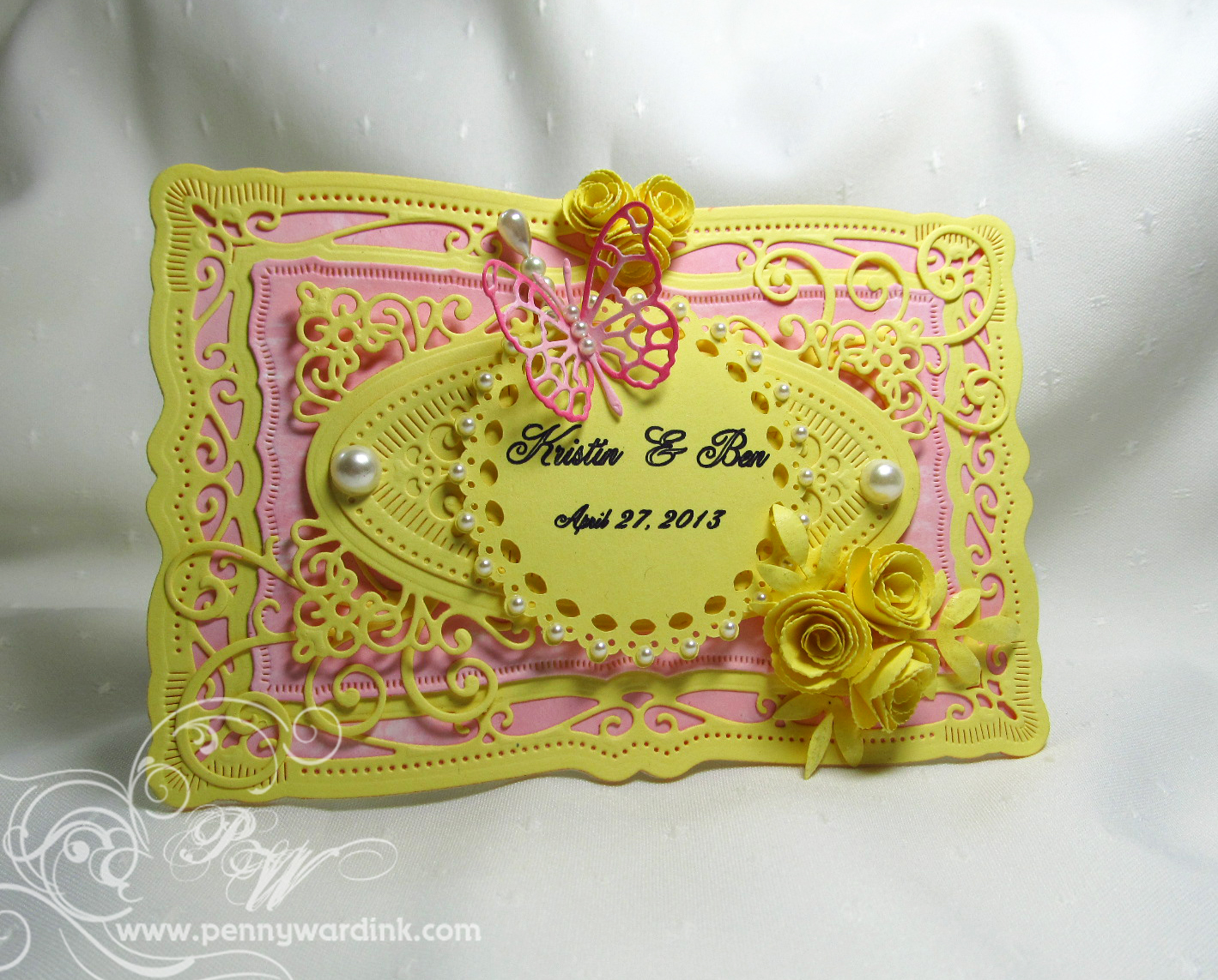 Made some tiny roses to cover up the mistake, and liked them so well I remade the 3 larger roses in yellow also. (The brides colors are yellow and light pink). I like the remade card better.