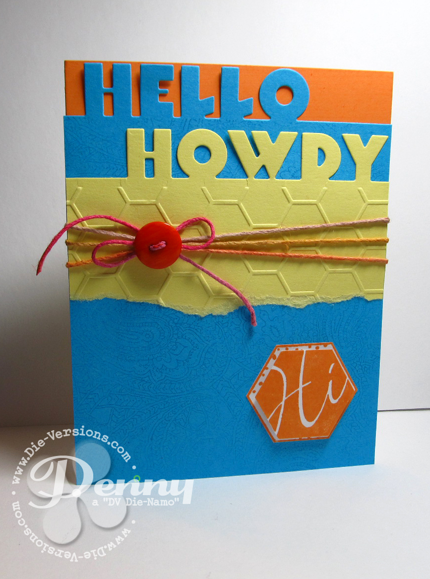 I used two Express Edges from Die-Versions on this card (Hello & Howdy). Stamped background is Penny Black (Paisley Outline) and the stamped hexagon is from Hero Arts (Clear Hexagons).