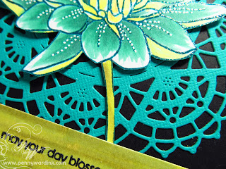 Flower and banner are popped up with foam for dimension. White Enamel Accents were added to the flower.