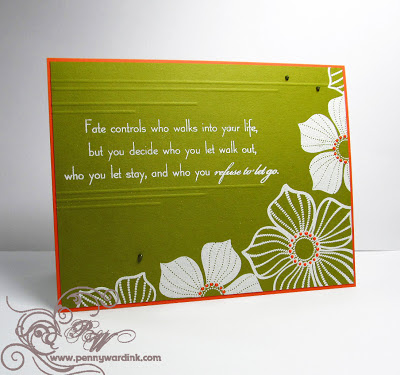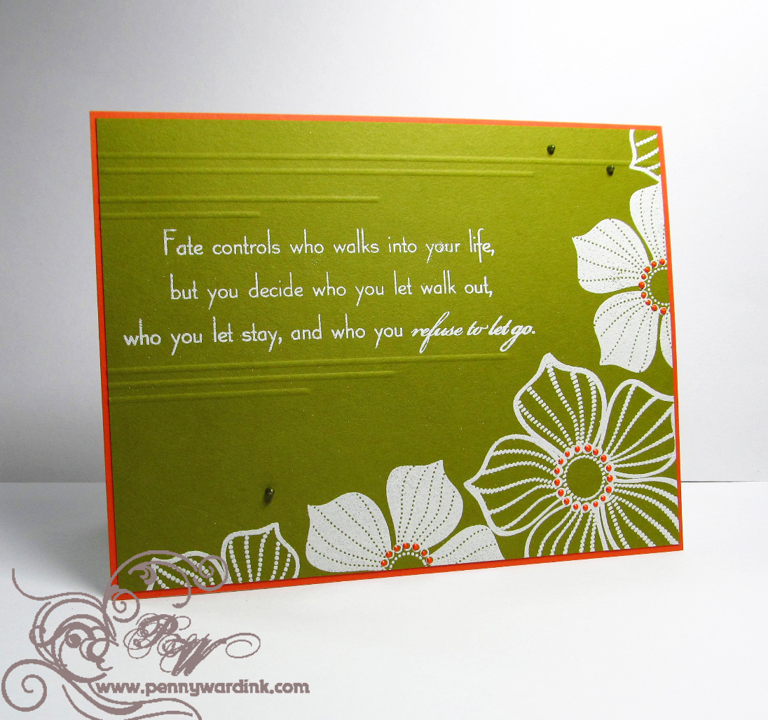 Stunning! I never pull off white embossing/stamping that well. (Maybe I need to practice more.) The stamp is beyond gorgeous, the sentiment is fabulous and I'm off to find it, and the score lines and pearls are the perfect touch! I never would've guessed Army green and orange could be so romantic!!!