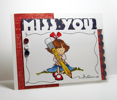 I colored her with Copics, die cut the sentiment edge Miss You by Die-Versions and used Authentique "Pride" for all the pattern papers. (and after taking the photo discovered the red paper is upside down....poopitz).