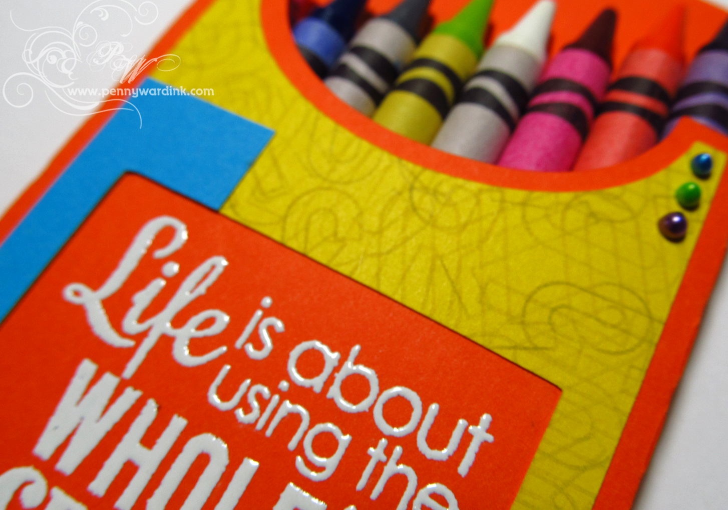 Crayon box made with Silhouette, stamped background with the word "color" all over using Watermark ink. Sentiment was stamped and heat embossed.