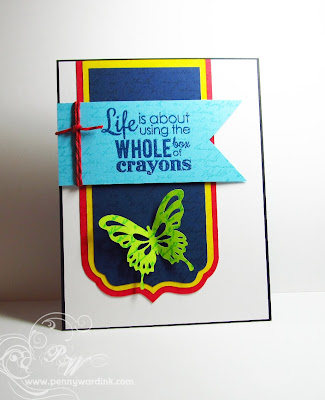 Playing along today with the Featured Stamper at Split Coast Stampers. We are to take a Featured Stampers (Wanda Guess) card and mix things up a bit. I really like the decorative edge of her banners, butterfly and words covering her sentiment panel. (You can see her card by clicking on her name).