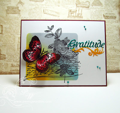 I cut a "mask" with my Silhouette and inked the square on my card, then stamped Kisses in the Sun (Penny Black 4306L). I stamped it a second time, colored the butterfly with Spectrum Noir markers, then fussy cut.