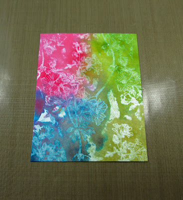 Cut white card stock to desired size (a coffee filter will cover an A2 card) and use spray adhesive.