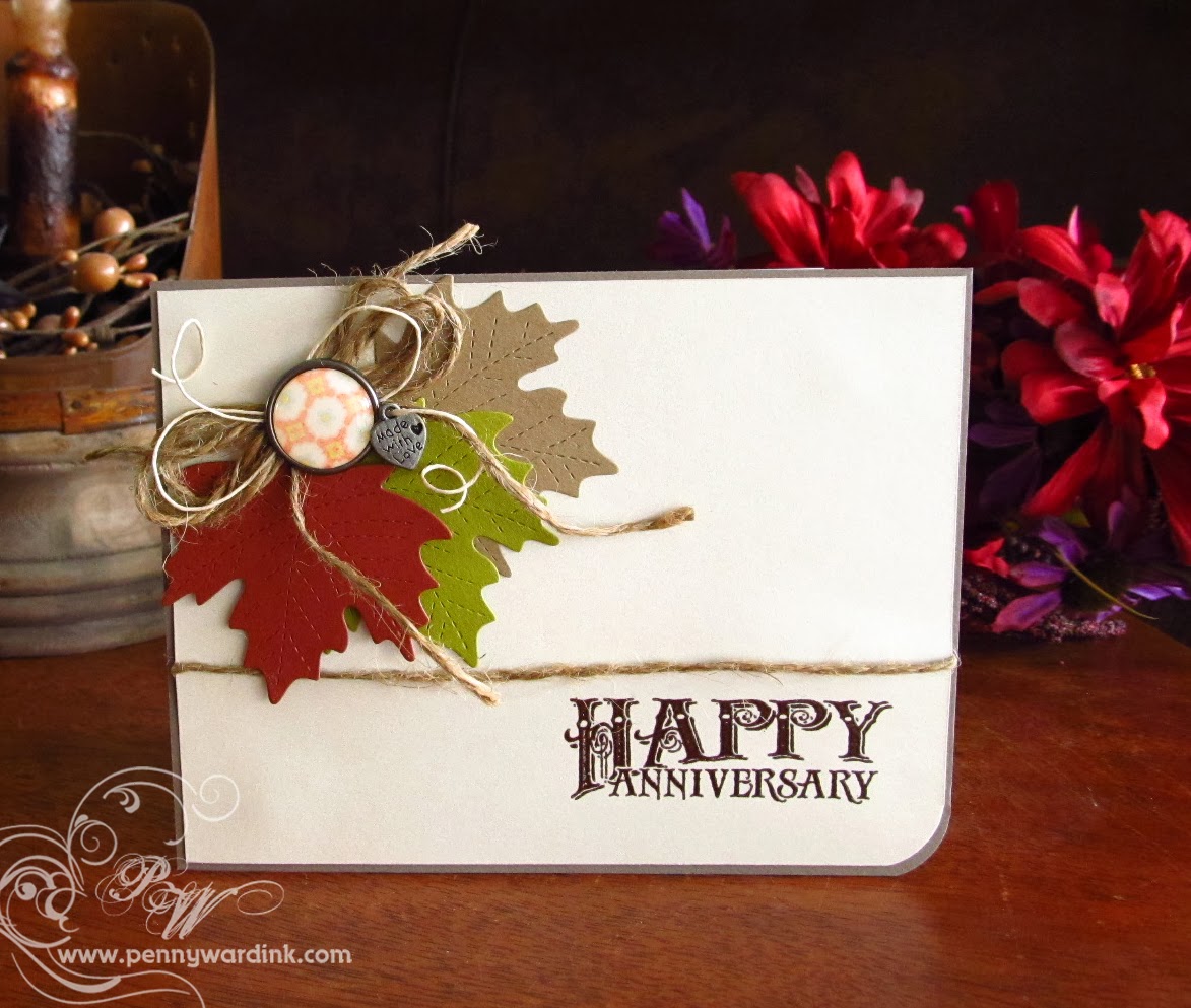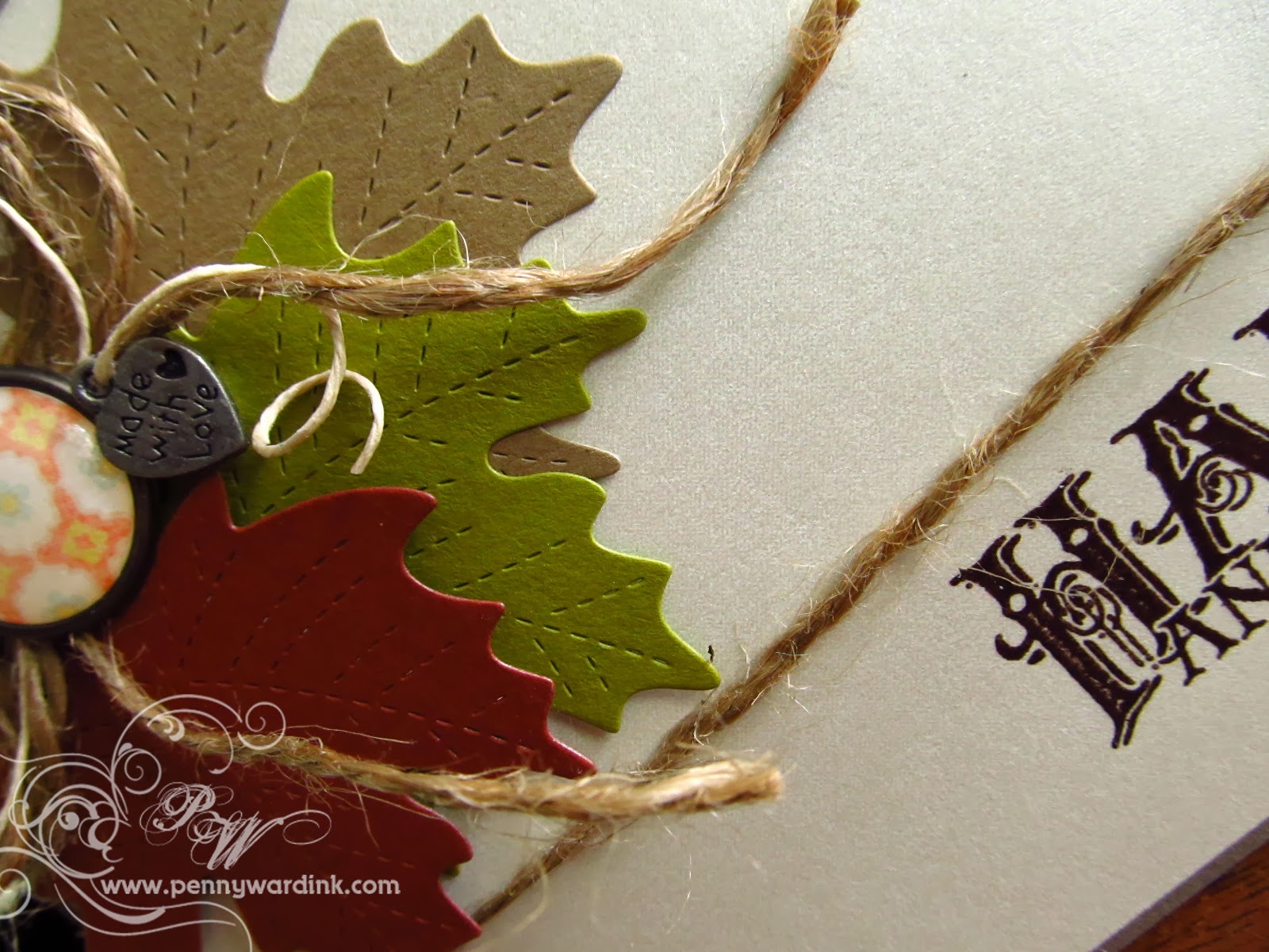 Super quick card, as all I did was stamp and heat emboss the sentiment (Sentimental by Penny Black) on Cream colored card stock, added the leaves and a little jute. Brad is by My Mind's Eye.