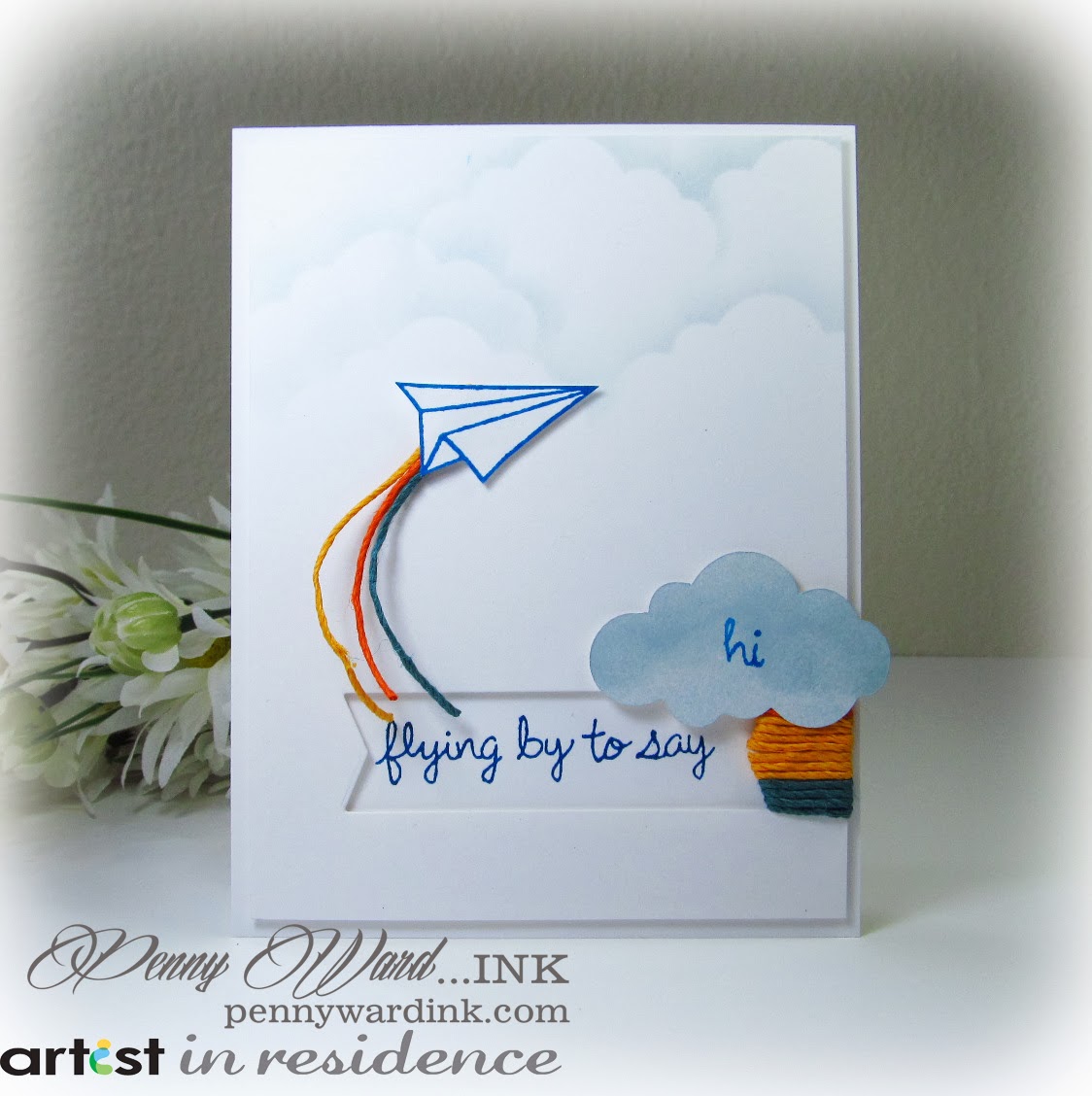 * Wrap one side of diecut area with twine. Ink clouds as shown (I used a handcut cloud as my mask, then as the embellsihment to stamp my greeting).