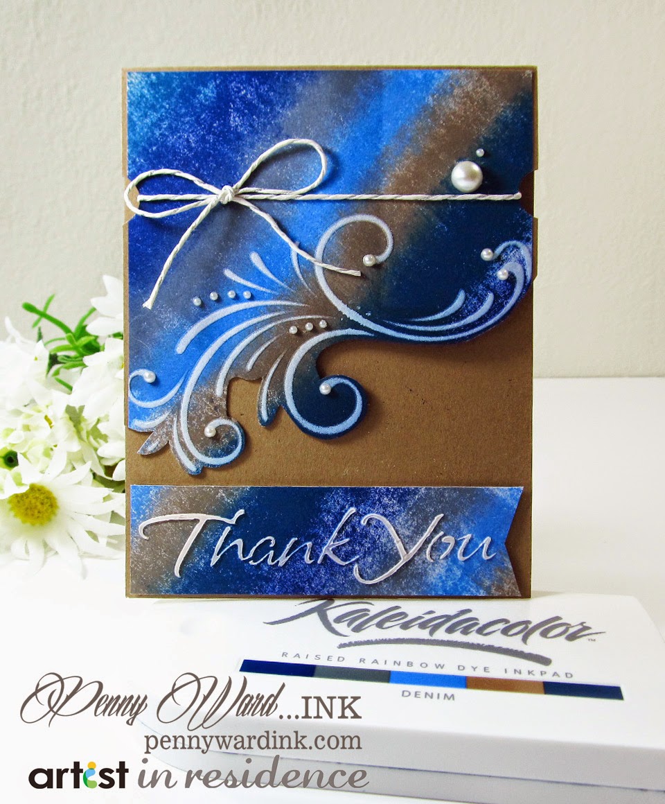 2) On white card stock, brayer on the Denim Kaleidacolor. Cut a panel measuring 4.25 x 4.50. Emboss Flourish and ink with Wedding White while stencil is still in place. Attach to card front, then trim around the Flourish.