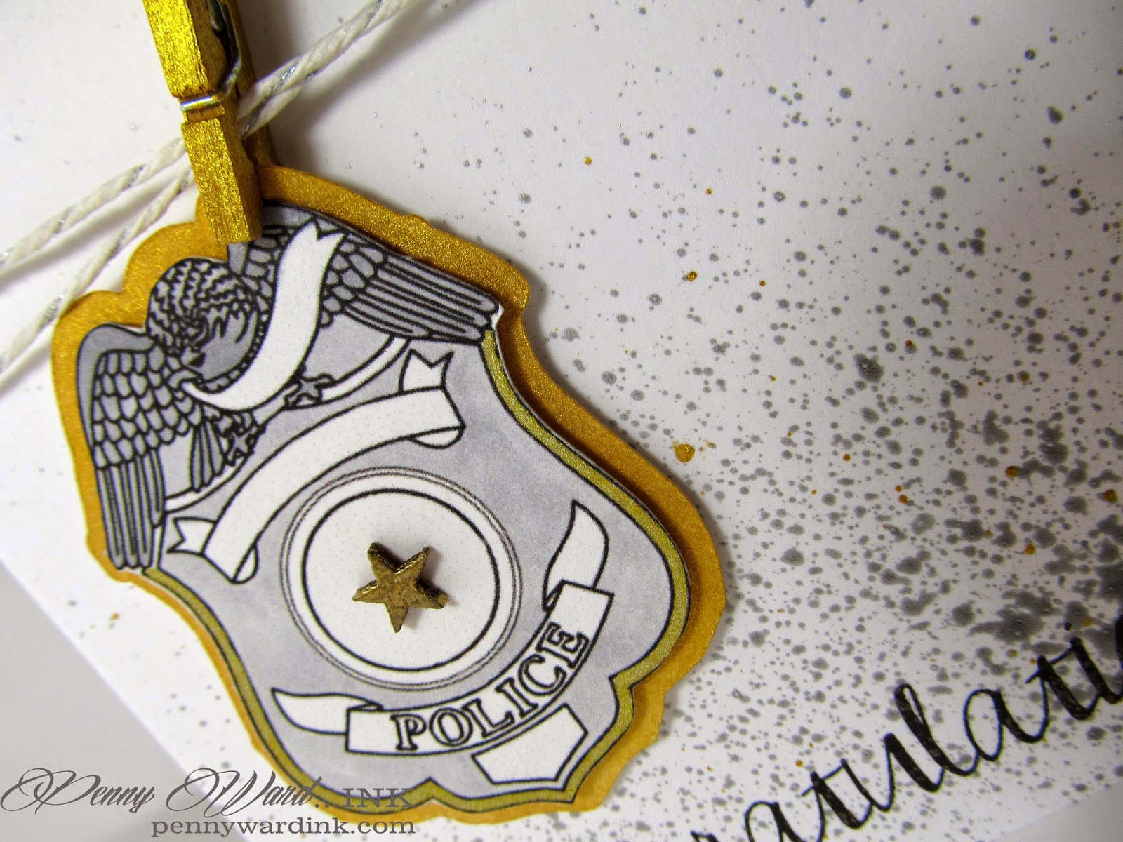 Badge was colored with Copics, card spritzed with Gold & Silver irRESISTible, Delicata Golden Glitz ink used behind the badge and on the clothespin.