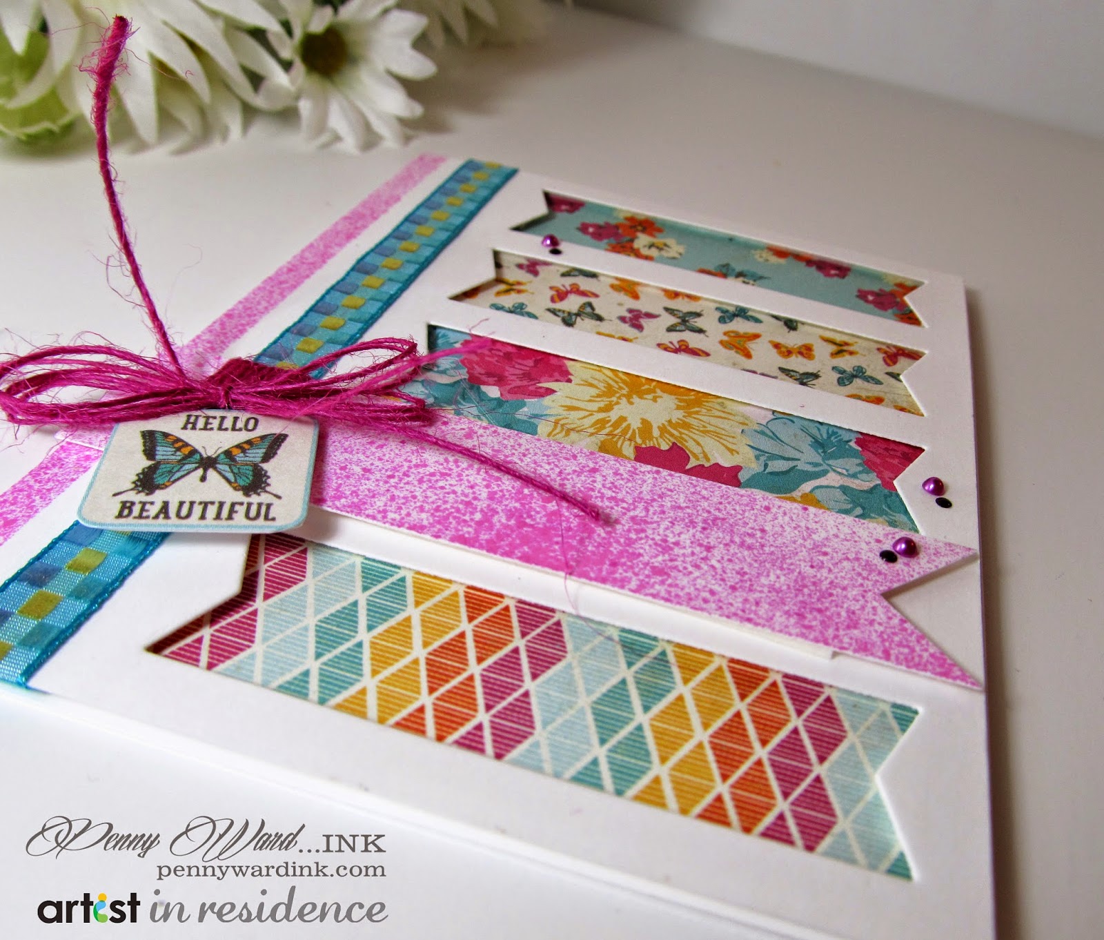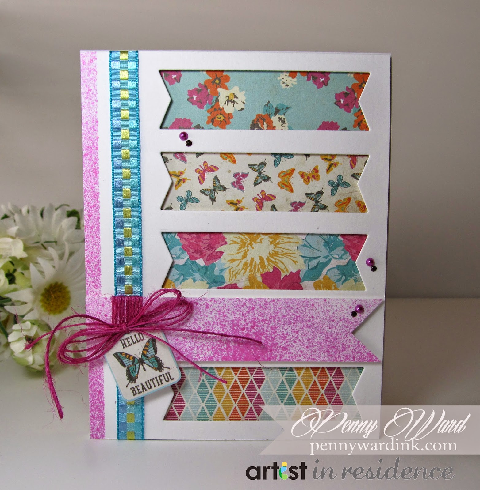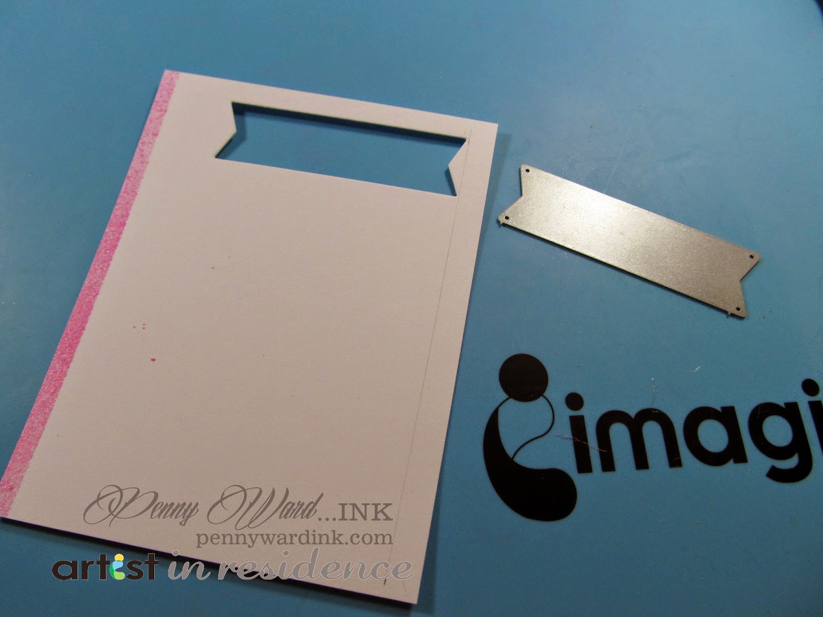 Cut white card stock just a bit smaller than the base. Lightly mark where you want your banner openings with pencil. Die cut four banner openings.  Cover back of this panel with foam adhesive, then adhere strips of four different Authentique Radiant papers.