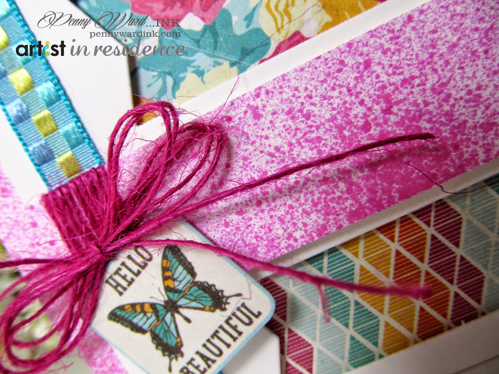 Wrap the card front with May Arts checkered ribbon. Adhere to base card. Attach spritzed banner that has been wrapped with fuzzy twine, Add "Hello" sticker and fuzzy twine bow. Add faux colored pearls and dimension dots made with Lilac Posies irRESISTibles Pico.