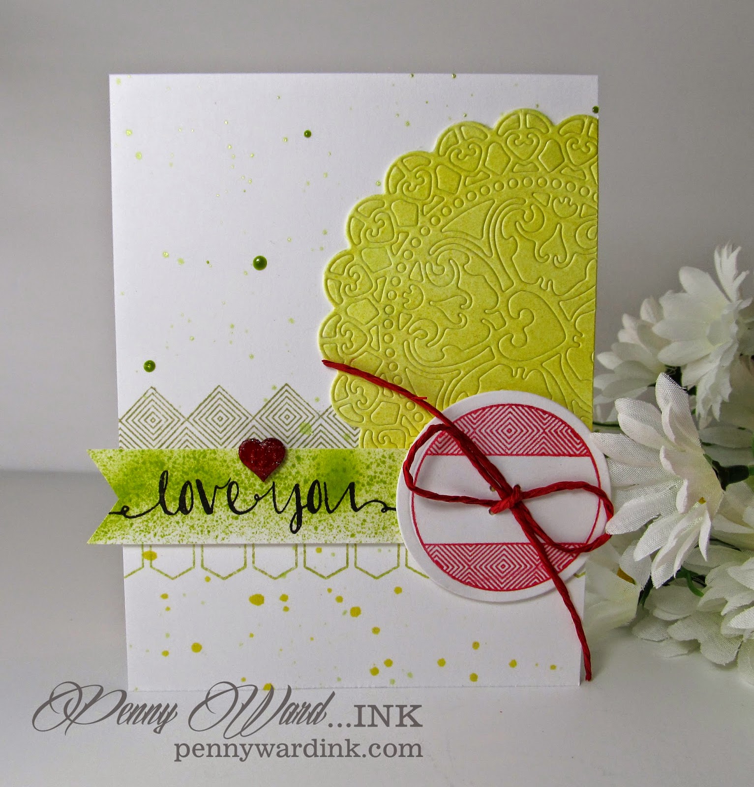 I die cut the leaves and used the negative as a mask for Ferro Graphite Embossing paste (LOVE) to add dimension to this card. Left over leaves were adhered with foam adhesive.
