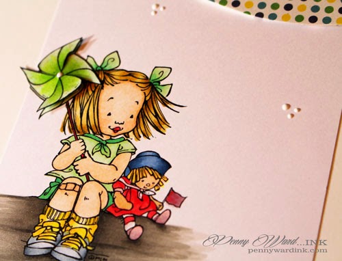 She was colored with Copic markers and a second whirygig was stamped, colored and fussy cut for a little dimension.