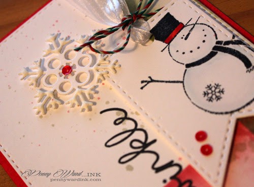 I masked a portion of the bottom and right side edges, then swiped the ink across the card stock. Die cut tag, stamped and colored snowman.