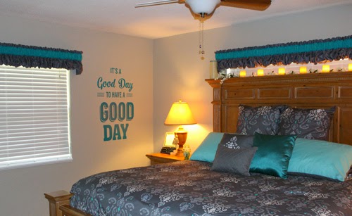 You have been a busy bee! Your creative touch is everywhere in your bedroom. Love the framed photos, the teal flowers, and the amazing valances! And that saying is something we should all live by. Thanks for sharing!!