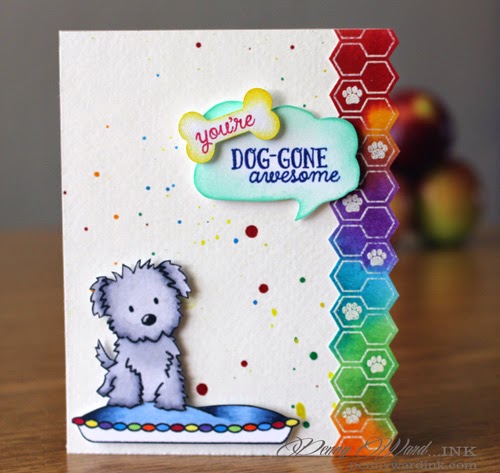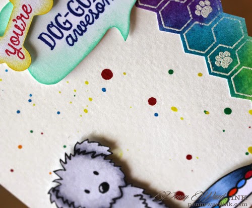 Your card is just Dog-gone awesome too! Love everything about it. ... the image, the side trim and the wonderful splatter background technique!