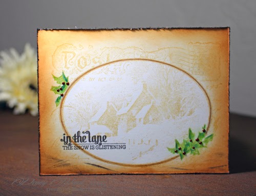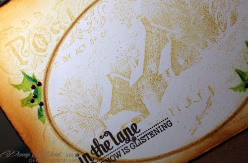 White card stock was stamped with Delicata Golden Glitz, edges inked and distressed. Holly was colored with pencils and Pico Love Letter was added for the berries.