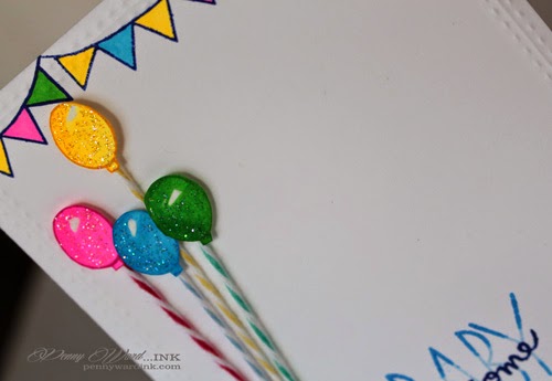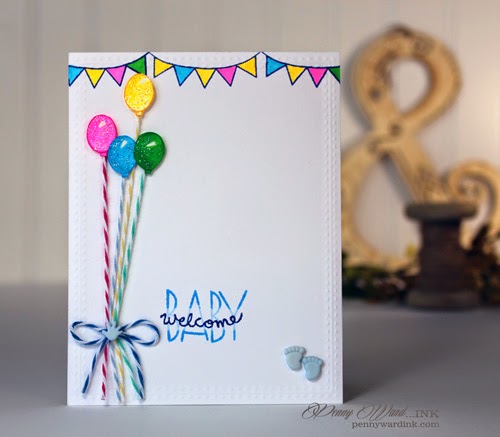 Fun baby card - love the twine and the bow and how it adds to how cool and authentic the balloons look!! Just super fun!! The sentiment looks really cool and what a sweet little banner along the top of the card!! Wonderful!!!