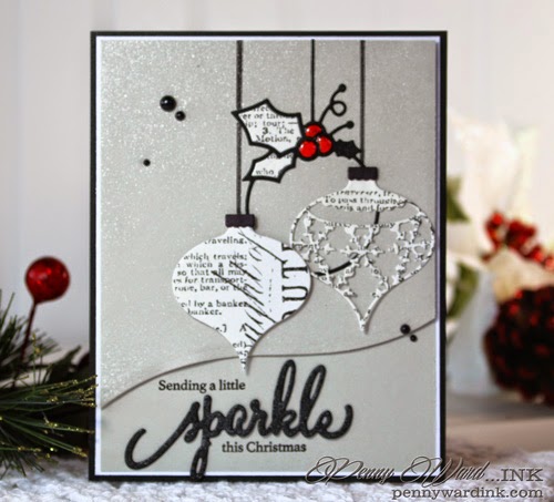 Love the design elements on this card. The newsprint ornaments and holly, the glossy touch of red and all that sparkle. Gorgeous.