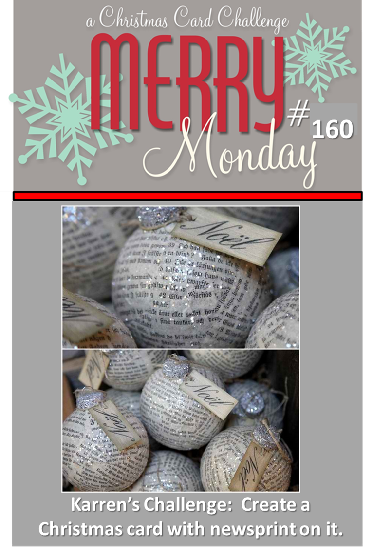 Merry Monday is looking for Newsprint on a Christmas card. Actually, this was quite fun as I just received a tissue paper roll by Tim Holtz and it had a small print on it. (Don't have any stamps that fit that bill, and I don't receive a newspaper, so this worked out quite well).