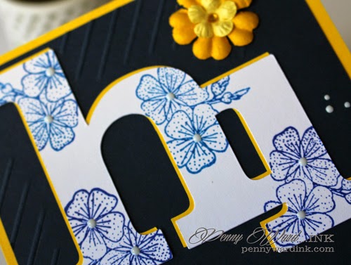 I die cut the large word from White card stock then used the Yellow die cut as the shadow. Stamped tiny flowers and added Pico Wedding Dress to flower centers.