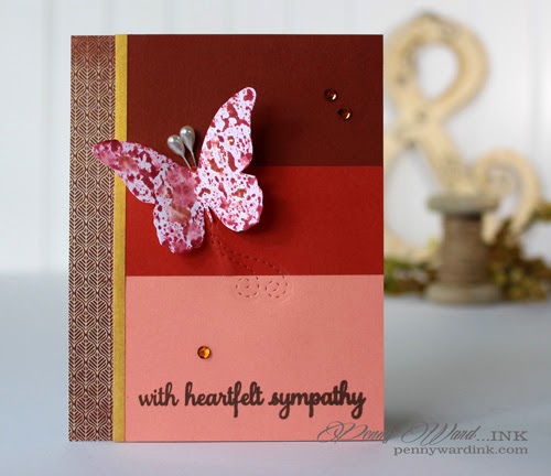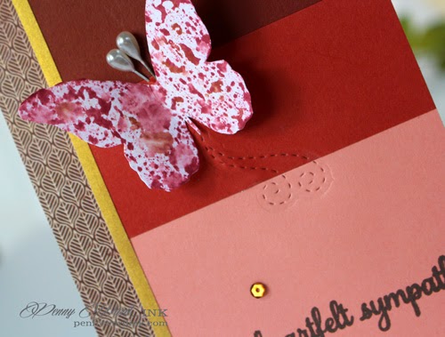 The butterfly stamp was colored with a Memento Rhubarb Stalk marker, spritzed with water then stamped on to white card stock to give it the mottled effect.