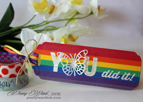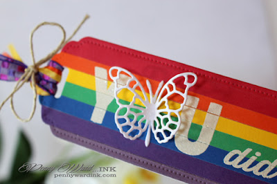 I loved the idea of using rainbow colors for my bookmark. By adding a simple embellishment like the Pippi Butterfly...you are able to give it to your recipient with the butterfly having some dimension, and they can use it in a book not having worry about ruining the bookmark, because the butterfly will lay flat also.