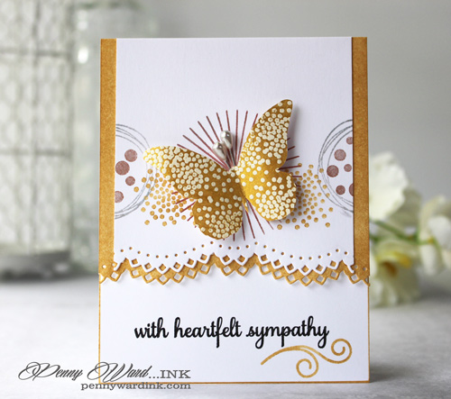 White cardstock was stamped and heat embossed with white powder. I then stamped the butterfly over that with Delicata Gold and trimmed.
