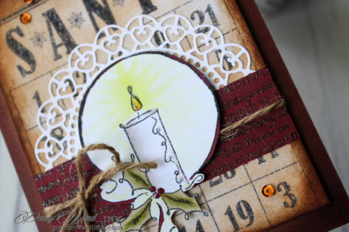 The panel between the doily and candle is a background stamp by Penny Black that was stamped and heat embossed with iridescent powder.