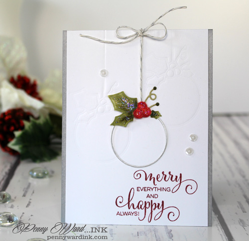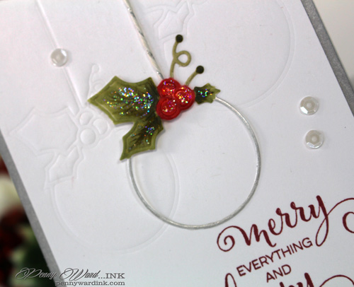 Colored the holly with Copic markers, shined up the sides of the card with Delicata Silvery Shimmer ink and stamped the brand new never been used sentiment using VersaFine Crimson Red ink.