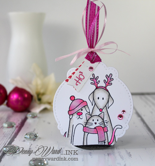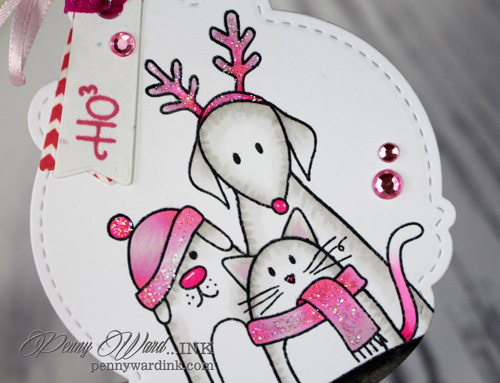 The animals were stamped and colored with Copic markers, then die cut into an ornament shape with my brand spanking new die from W Plus 9.