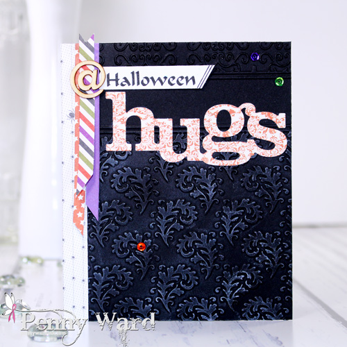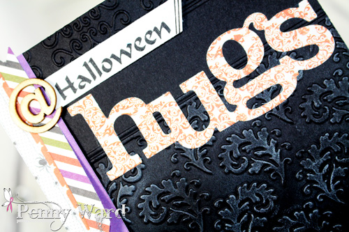 Die cut "hugs", added a few strips of pattern paper and a strip of spider paper down the side (see...like the inspiration card, mine too has a spider).