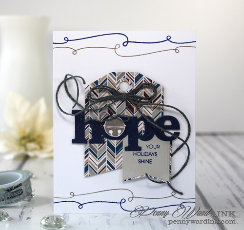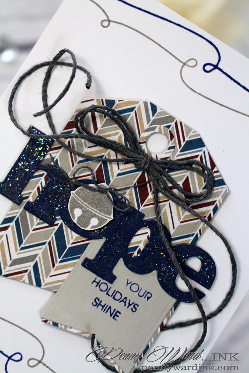 I stamped the jingle bell in Warm Wool ink, then stamped again with Delicata Silvery Shimmer giving it a very rich look.