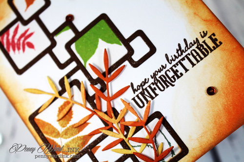 I love the Autumn Leaves stamp! After die cutting the Square Links from White card stock, I stamped the leaves in the tiny squares with the new inks by W Plus 9 (oh so yummy Fall colors).
