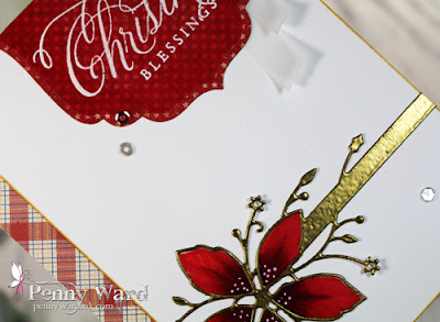 After die cutting the Poinsettia Ribbon, I inked it with VersaMark and heat set with Gold powder.