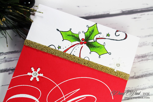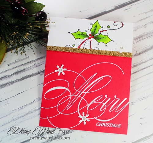 Heat embossed sentiment (still loving this wonderful font), a Copic colored Holly and a few snowflakes.