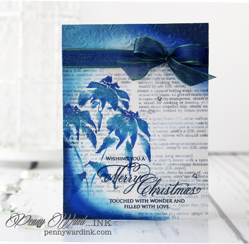 Stamped Poinsettias in Blues and Teals using a Misti stamping tool.