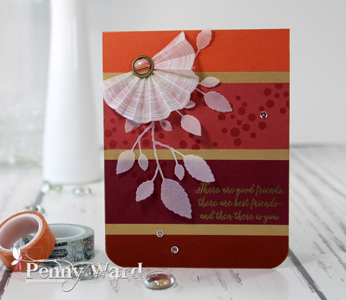 I stamped the wonky circles from the same stamp set onto Vellum. Cut out the circle, sliced it to the center, then fan folded it to make a half medallion.