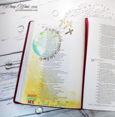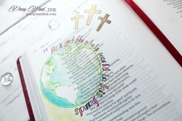I used a few of the stamps from the new John 3:16 stamp set...and as I am stamping the World onto the page, I am singing "He's got the whole world...", so I penciled in the words to the song and then colored them with Gelly Roll pens.