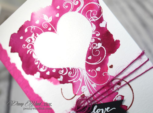 Masked the heart on watercolor paper, then added all the pretty pinks and reds. Stamped and heat embossed the swirly heart with white powder.